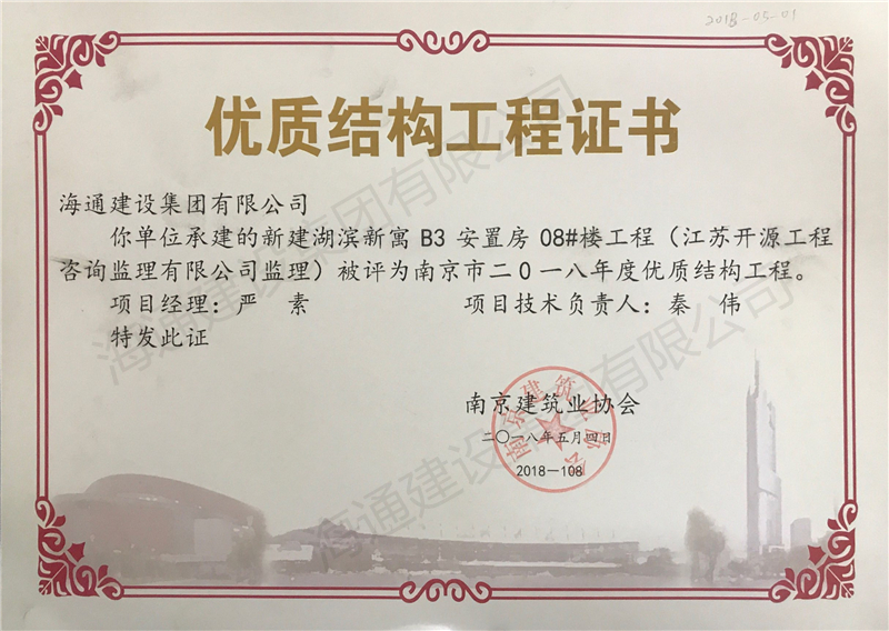 南京市優(yōu)質結構2018-新建湖濱新寓B3安置房08#樓工程