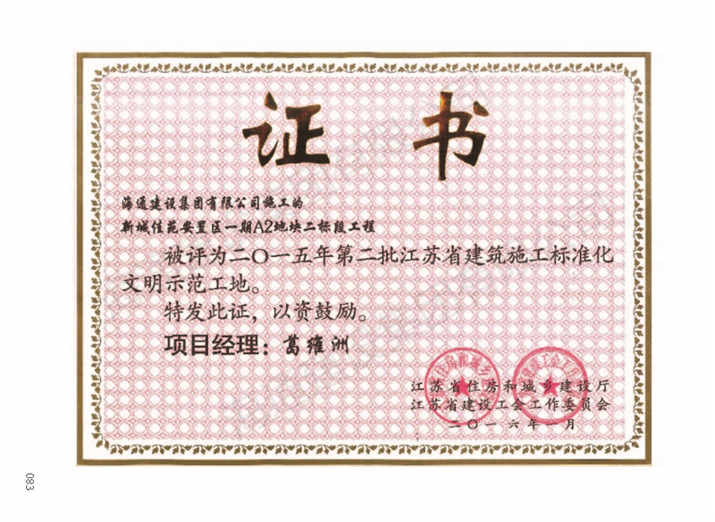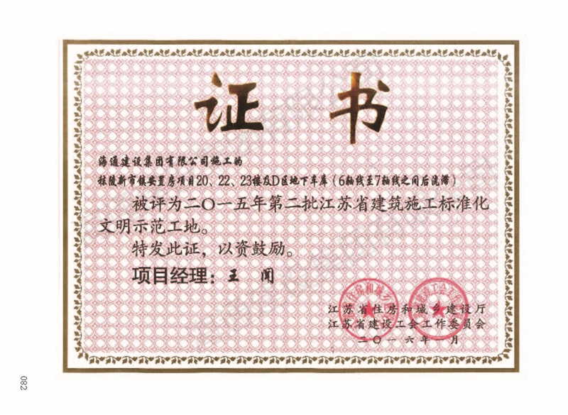 江蘇省文明工地2016(秣陵新市鎮(zhèn)安置房項(xiàng)目20.22.23樓及D區(qū)地下車(chē)庫(kù))