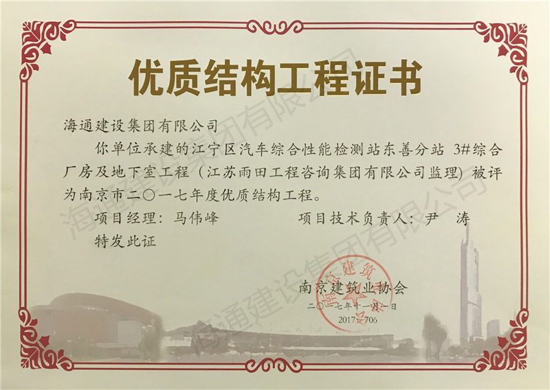 南京市優(yōu)質(zhì)結(jié)構(gòu)工程2017-江寧區(qū)汽車綜合性能檢測站東善分站3#綜合廠房及地下室工程