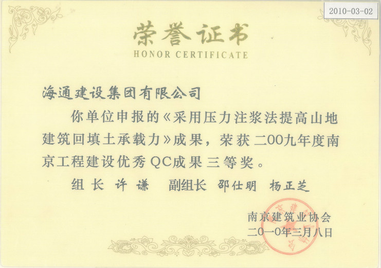 南京工程建設優(yōu)秀QC成果三等獎