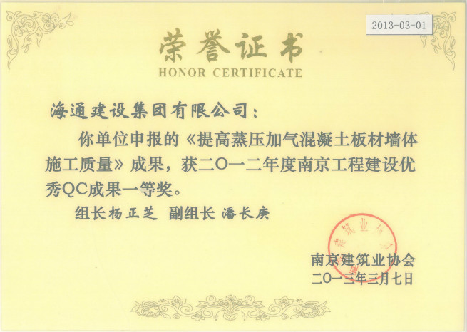 2012年度南京工程建設(shè)優(yōu)秀QC成果一等獎