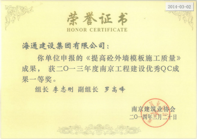 2013年度南京工程建設(shè)優(yōu)秀QC成果一等獎