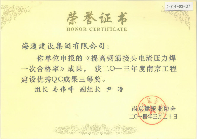 2013年度南京工程建設(shè)優(yōu)秀QC成果三等獎(jiǎng)