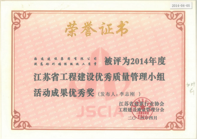 2014年度江蘇工程建設(shè)優(yōu)秀質(zhì)量管理小組活動成果優(yōu)秀獎