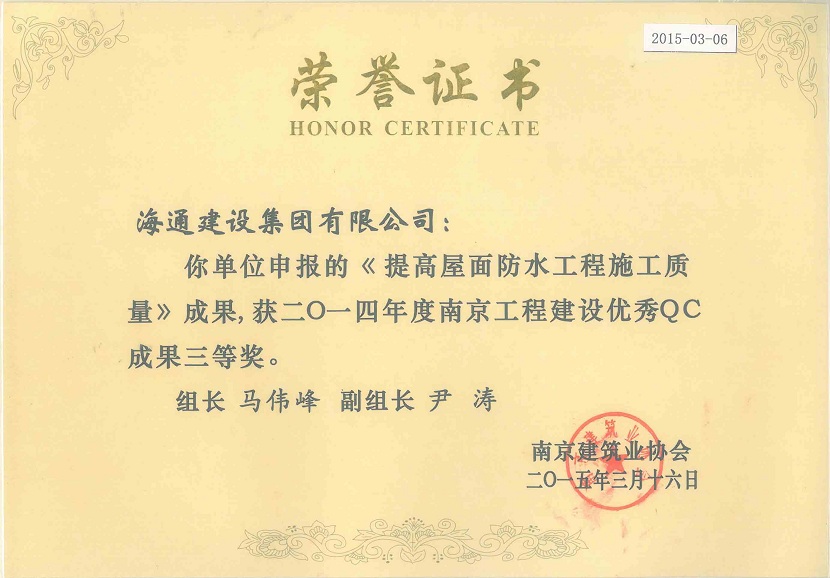 南京工程建設(shè)優(yōu)秀QC成果三等獎