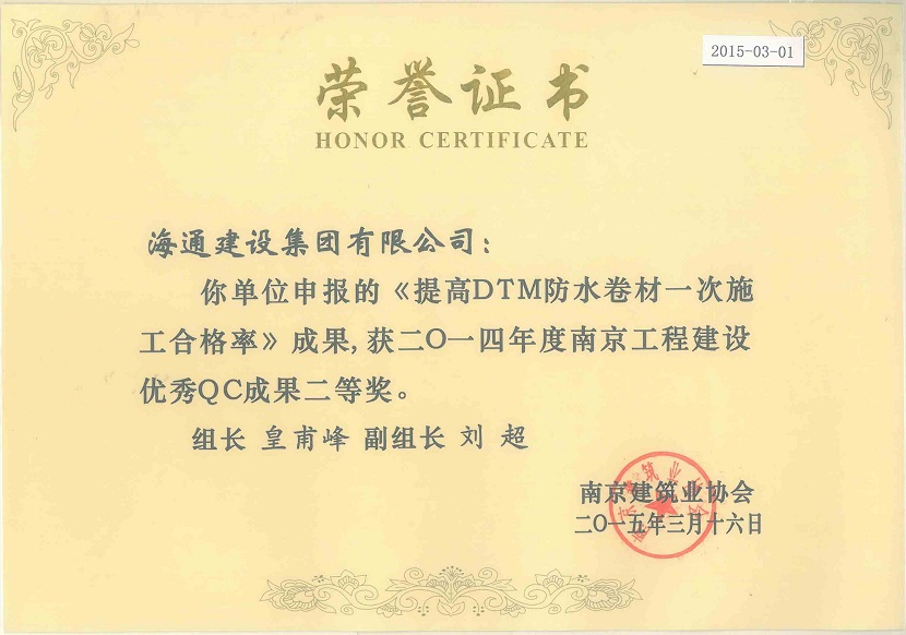 南京工程建設優(yōu)秀QC成果二等獎