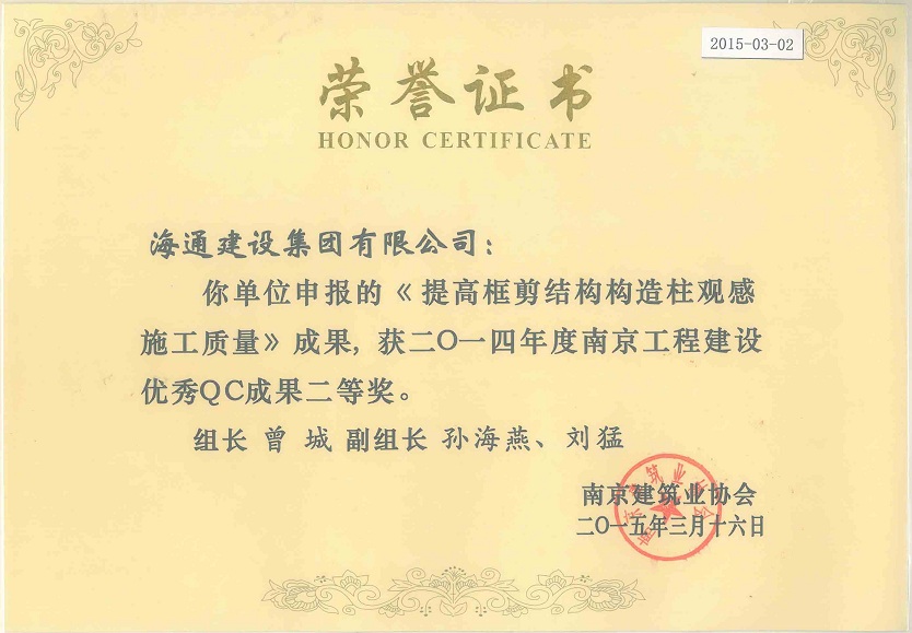 南京工程建設(shè)優(yōu)秀QC成果二等獎