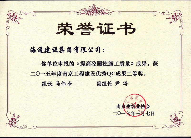 南京工程建設(shè)優(yōu)秀QC成果二等獎