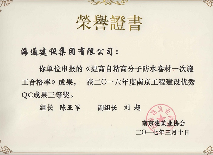 南京工程建設(shè)優(yōu)秀QC成果三等獎