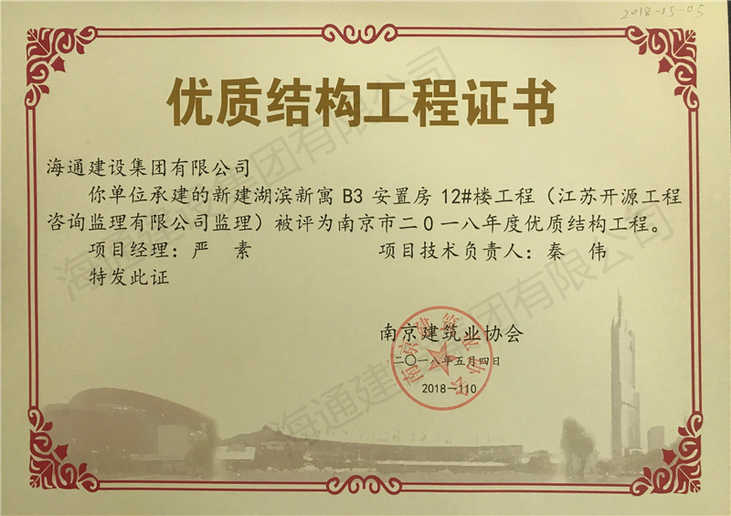 南京市優(yōu)質結構2018新建湖濱新寓B3安置房12#樓工程